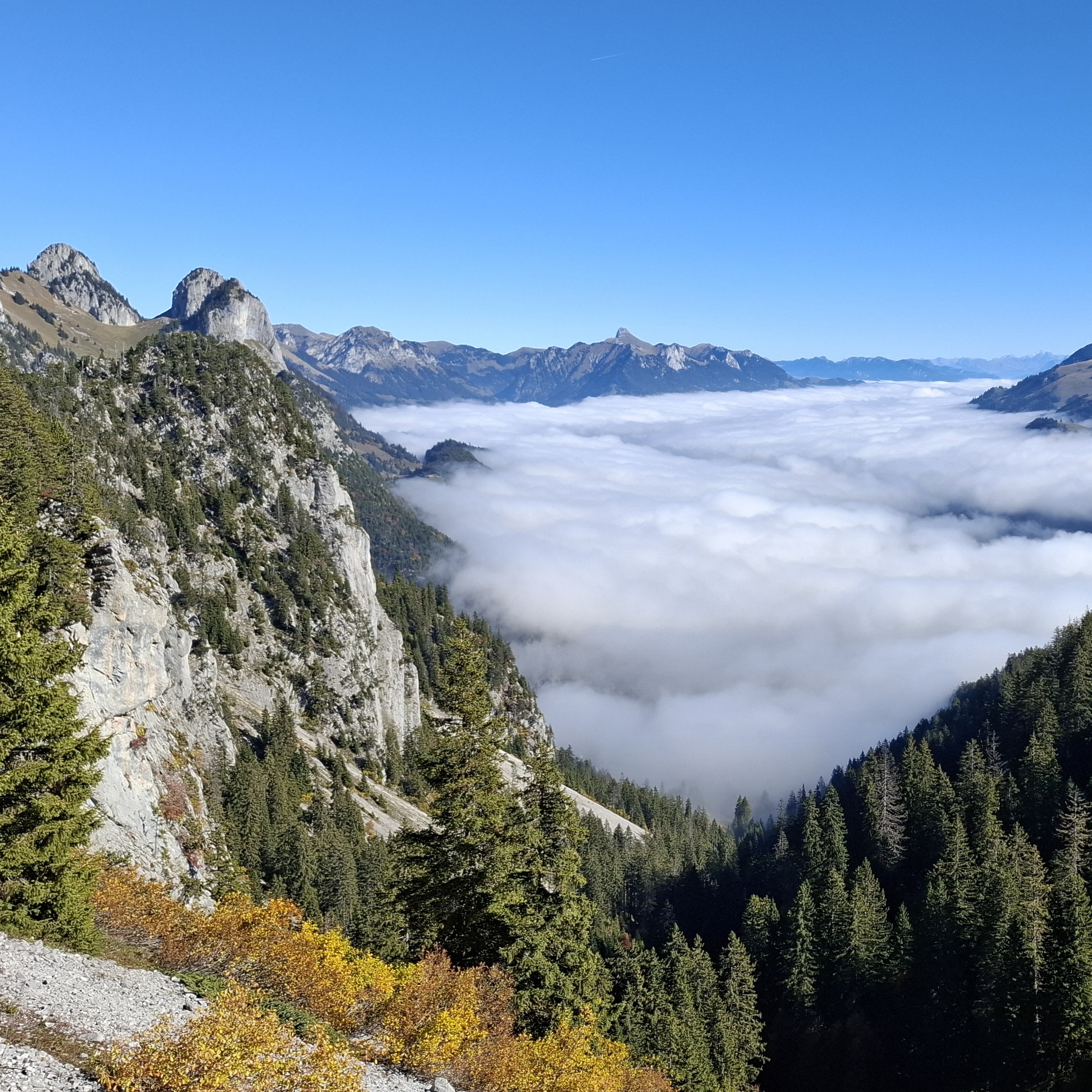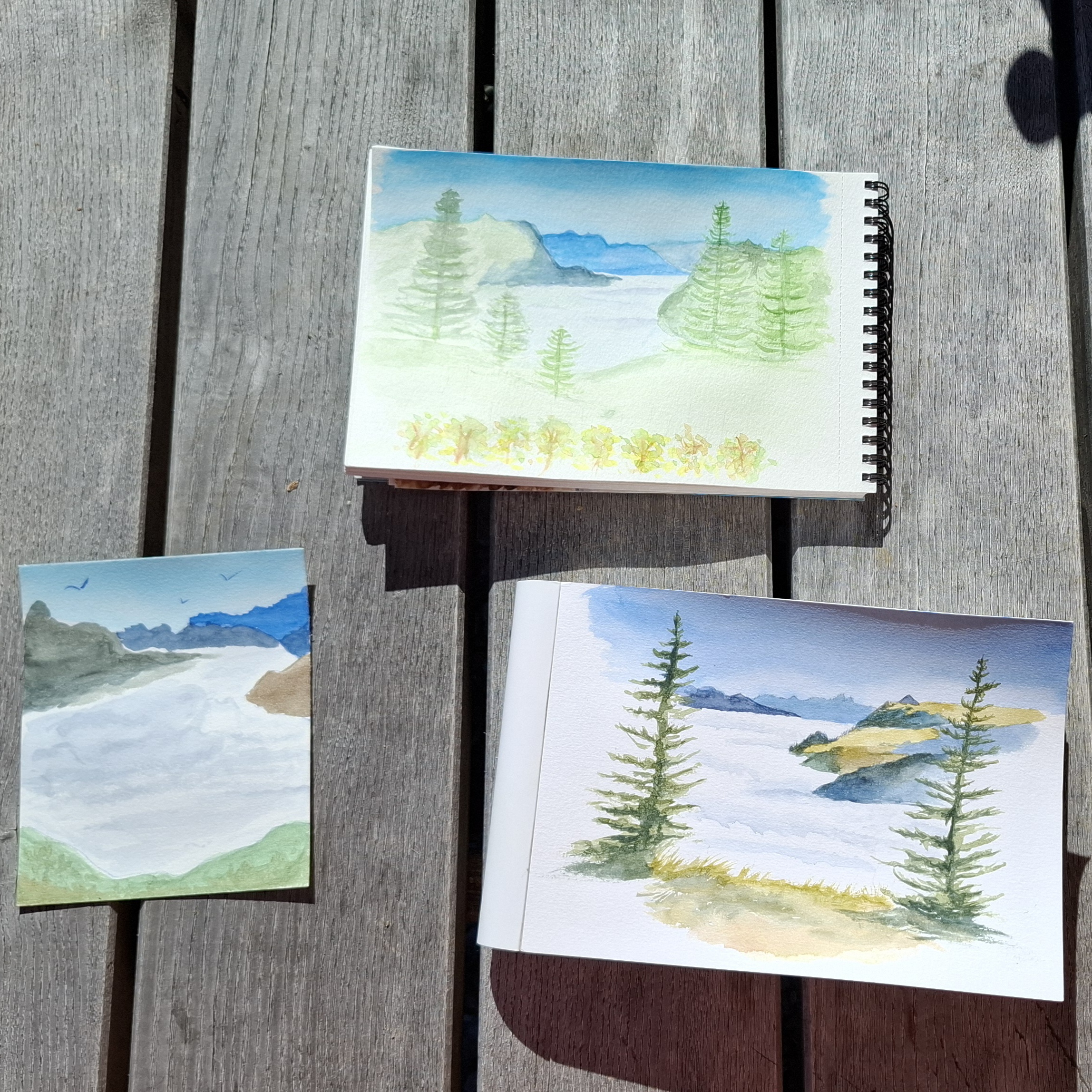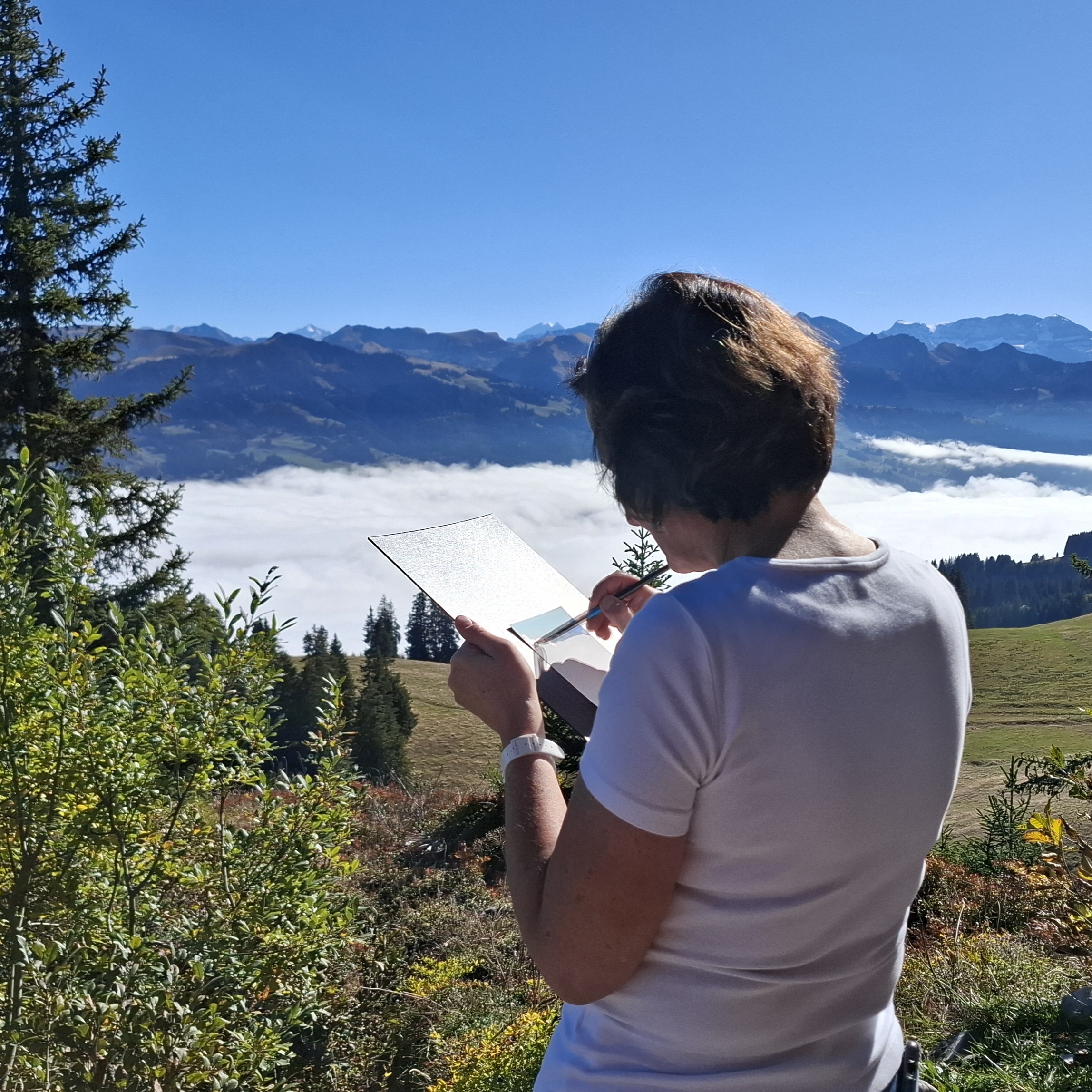 J'ai emmené le groupe découvrir les Préalpes avec leurs beautés automnales 🤩 Nous avons pris un beau bain de soleil et couché sur papier ce magnifique paysage brumeux 🎨 Des paysages à l'allure simple peuvent cacher des difficultés à être dessinés mais mes clientes ont su honorer leur beauté 😊